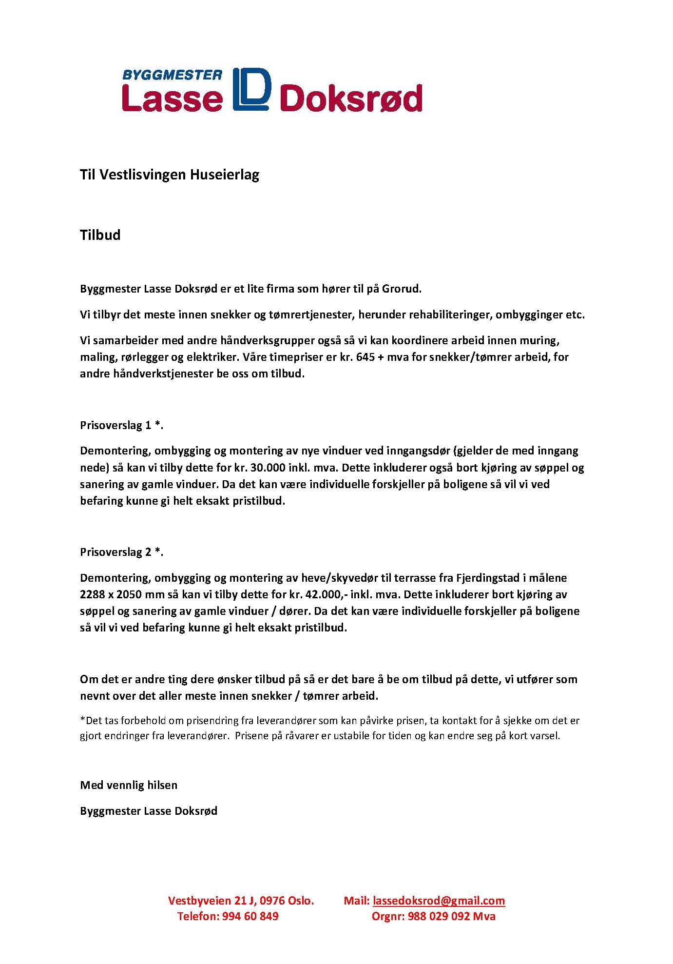 Tilbud på tømrertjenester til huseiere i Vestlisvingen Huseierlag